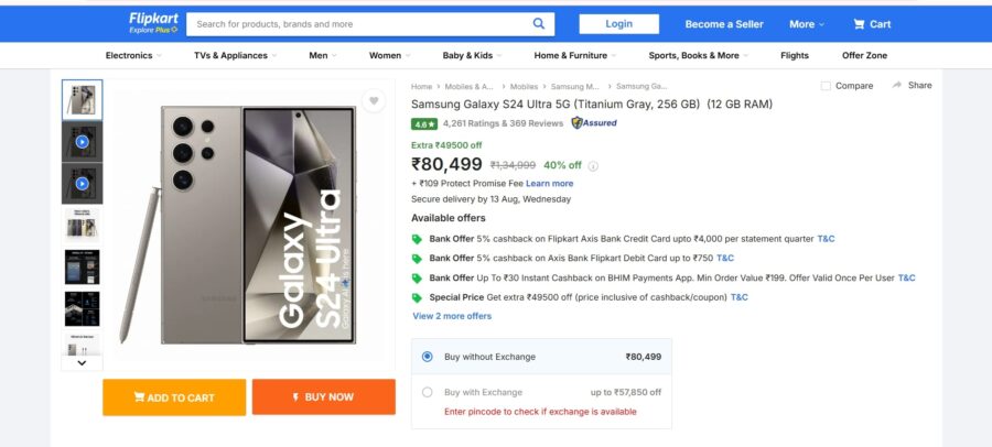 सिर्फ कुछ महीने पहले लॉन्च हुआ S24 Ultra भारत में ₹1,29,999 की कीमत पर आता था। अब Flipkart और Amazon पर इसका 12GB RAM + 256GB स्टोरेज वेरिएंट सिर्फ ₹81,799 में मिल रहा है। मतलब सीधा ₹48,200 की बचत। और अगर आपके पास HDFC या कुछ चुनिंदा बैंक का कार्ड है, तो EMI ऑफर से कीमत और भी कम हो सकती है।